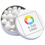- Scatolina in latta lucida di colore bianco contenente 18 g mentine senza zucchero. Riempibile, sigillata con nastro da strappare