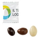 Mandorle e cioccolato: il mix perfetto tra frutta secca e dolce da offrire in ogni occasione. Per un regalo gradito o come gadget per il prossimo evento, queste mandorle di cioccolato al latte, fondente e bianco, finemente ricoperte, racchiuse in un sacchetto bianco e lucido, delizieranno i destinatari. La personalizzazione sarà un gioco da ragazzi: aggiungi il tuo logo, slogan o i contatti utilizzando il nostro studio intuitivo. Hai bisogno di assistenza? I nostri esperti di design sono a disposizione per aiutarti a dare vita alle tue idee.