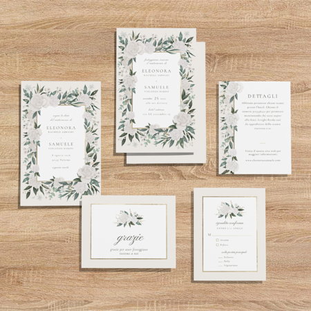 Il set di articoli di cancelleria per matrimoni più classico è composto da biglietti Save the date e partecipazioni, accompagnate da biglietti di risposta o bigliettini da allegare. Se vuoi dare agli invitati la possibilità di rispondere all’invito online, includi un codice QR con un link al sito web del tuo matrimonio all’interno degli inviti.
