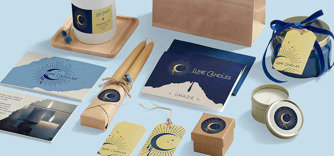 Dai un’occhiata a tutto ciò che Lune Candles usa per comunicare un’immagine aziendale coerente e professionale attraverso i prodotti per il packaging.