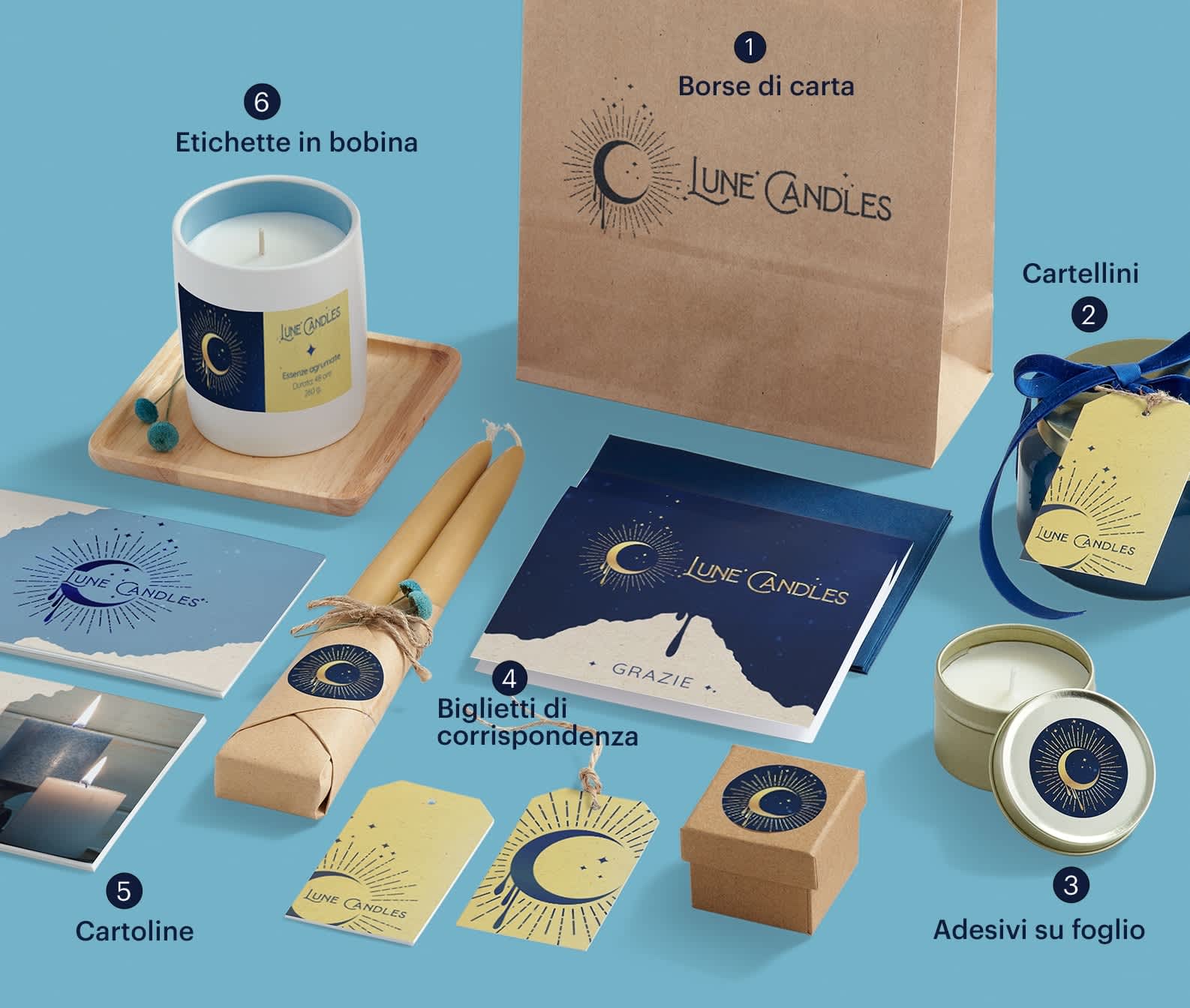 Dai un’occhiata a tutto ciò che Lune Candles usa per comunicare un’immagine aziendale coerente e professionale attraverso i prodotti per il packaging.