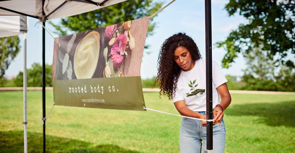 Nei mercati, Kelly usa gli striscioni per decorare il suo stand. “Uso uno striscione come sfondo e ne metto un altro davanti al tavolo. Entrambi contengono solo il logo e la scritta ‘Rooted Body Co.’” In futuro, Kelly prevede di inserire altri articoli promozionali nella sua strategia di marketing, come volantini, taccuini, tazze e cappelli.