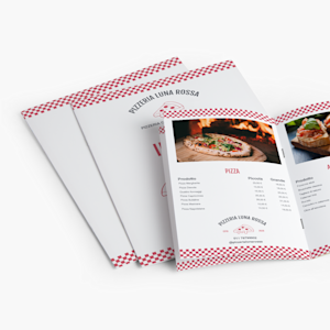 Crea menù personalizzati per mettere in risalto la tua offerta. Opuscoli rilegati a punto metallico di un massimo di 28 pagine in formato A4 o A5 verticale.