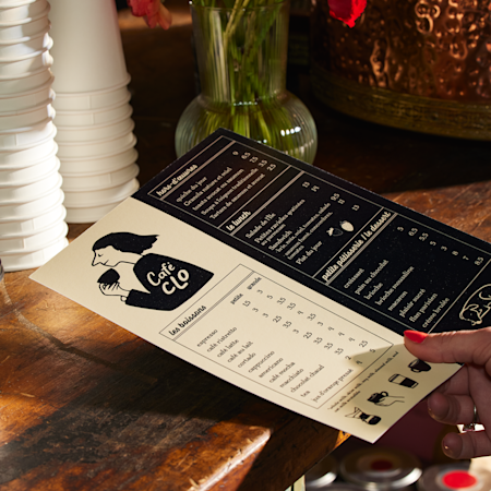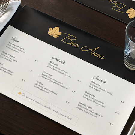 Scegli quello più adatto alla tua attività tra un’ampia gamma di stili. I menù piatti offrono semplicità ed eleganza, mentre i menù a 1 piega, a 2 pieghe a portafoglio e a 2 pieghe a fisarmonica sfruttano al massimo lo spazio a disposizione per proposte e promozioni dettagliate. Hai bisogno di un prodotto resistente da usare all’aperto o in ambienti molto frequentati? I menù in cartone piuma, resistenti all’acqua e riutilizzabili, sono perfetti per i locali più affollati. Oppure puoi aggiungere un tocco personale in più con le tovagliette personalizzate, per esporre il menù e mantenere puliti i tavoli allo stesso tempo.