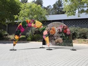 Per le bandiere pubblicitarie ad arco utilizziamo una tecnica di stampa a sublimazione su poliestere traslucido, che le rende lievemente trasparenti e fa sì che il design risulti visibile da entrambi i lati.